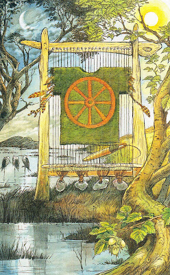 The Wheel represents movement and is a reminder that change is the natural order of all things. Of course that change doesn't happen on my timetable. What I love and enjoy is the clay that sticks to the rim of the wheel, then eventually dries and falls off (too soon), much like friendships or jobs I didn't want to see end. Then there is the pine sap that sticks and stays for what seems like forever, such as the annoying coworker or health issue that feels as if it will stick around forever. Yet even the sap wears off eventually. The loom in this image is between two hazel trees which suggest wisdom. Though I can't fight fate, I am not powerless - I still have choices. Even if that choice is in the attitude I have as that wheel turns, I can let wisdom be my guide.