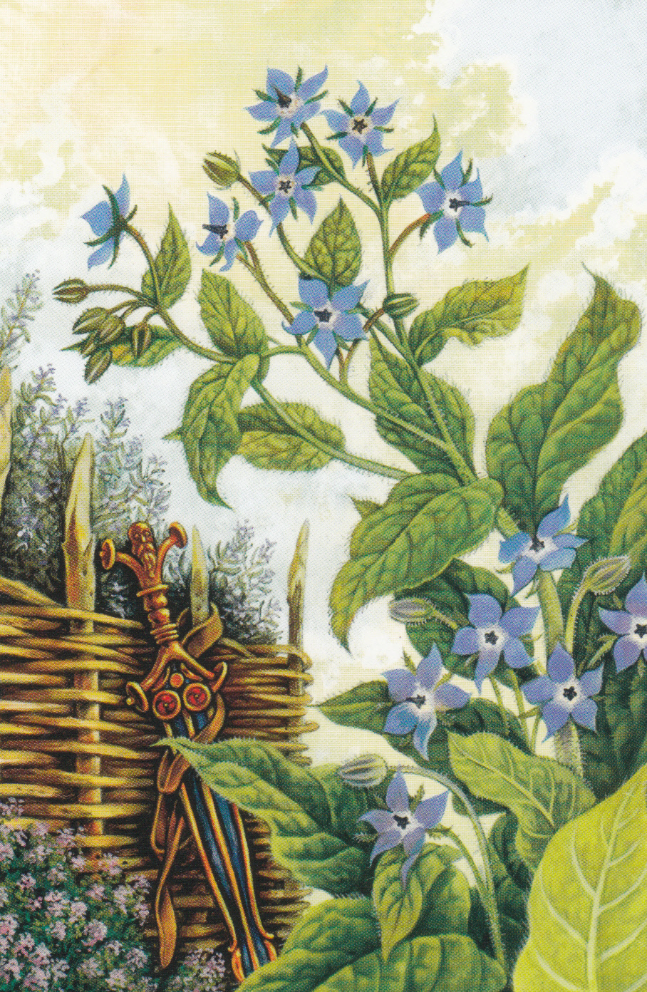 Naked, mouth stuffed with leaves, and hands bound, this hanging man illustrates those situations in which we are powerless. His legs form an upside-down four, the number of stability, suggesting there is nothing to be done to secure and steady the present circumstances. Why drive ourselves crazy trying to wage a battle that we won't ever win? Borage (aka Starflower) is an herb that has been used for centuries to 'comfort the heart' (depression). Thus this plant is associated with courage, not the kind used in wars, but the type that helps us deal with the vicissitudes of daily life. This type of fortitude reminds us that things will eventually change and permits us to engage in self-compassion.